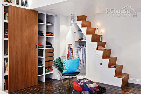 另外我们还注意到一个内置的书柜,它的高度直达客厅的装饰性天花板,并且连接到了夹层的卧室。