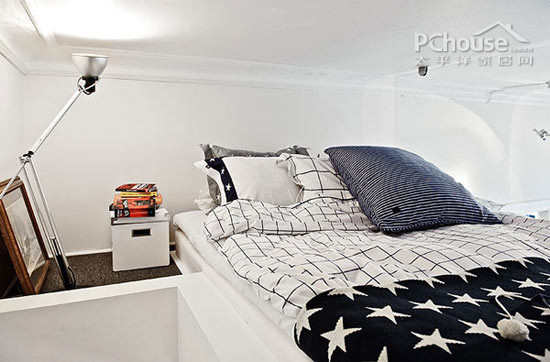 夹层上面直接是一个卧室,映入眼帘则是黑白风的床品,黑白条纹略带严肃,不过星星的装饰,则是多了几分俏皮。