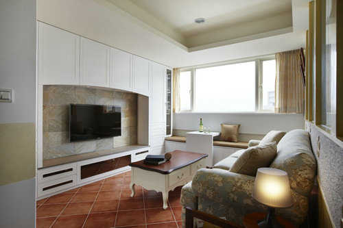 其实这个客厅的采光非常好,每天清晨整个屋子都溢满阳光,一朵朵花的沙发被衬得温情而浪漫。电视墙就运用了简约的木框设计图案,只要都是以墙体颜色为主,电视柜小巧又实用。