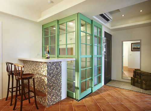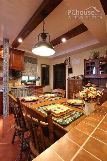 马赛克的贴面柱子,本是业主的头痛之处,经过设计师的巧夺天工的设计,让业主心满意足。配上复古风味的木制橱柜和相似颜色的地板。向大家诠释了田园风格的另一面的细致。
