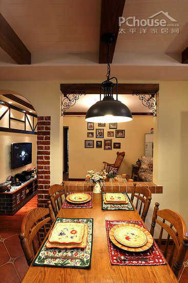 餐厅设计用得吊灯是是采用常见实用的普通吊灯。突显生活的简约与朴实。餐桌旁的拱门与花窗设计,不仅是小清新田园风格的代表。同时也为视觉更加宽阔打基础。