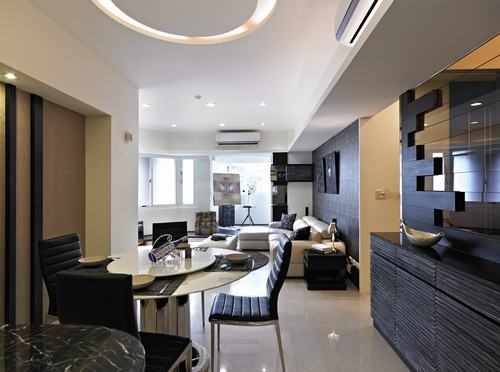 原格局中封闭的书房,设计师将空间分界打开,利用白色百叶弹性分野亦或开敞。串连后的空间和客厅可轻松互动,也让居家方城之战有了舒适安排。