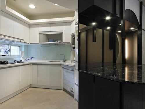 与厨房及书房相邻,白色压克力好清理的材质搭构起电器柜,突出面当成把手,现代利落造型兼具实用机能。