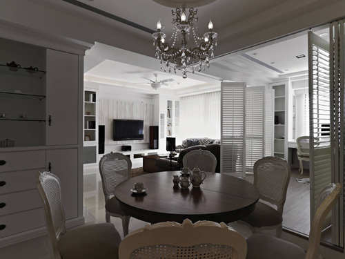 2.原格局中封闭的书房,设计师将空间分界打开,利用白色百叶弹性分野亦或开敞,串连后的空间和客厅可轻松互动,也让居家方城之战有了舒适安排。