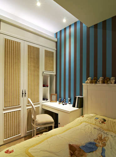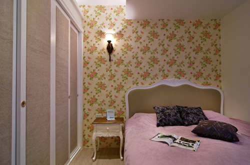 业主夫妇来台北探亲时可入住的客房,以壁纸铺排呈现柔美气息。L型的收纳动线,结合着雾玻与明镜材质,做出穿衣镜的实用功能。