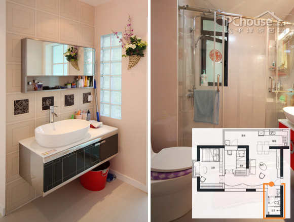 公共卫浴干湿分区:洗手盘、左侧区、淋浴区三块各自分开。