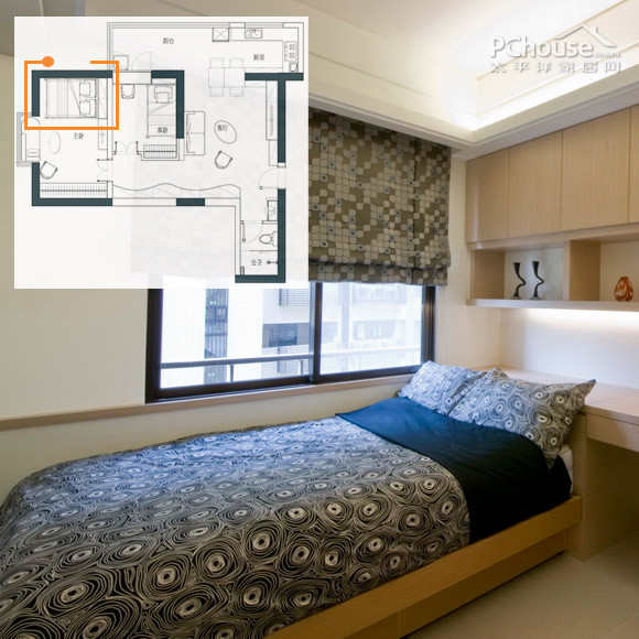 六、主卧设计:床头与电视柜整体收纳,飘窗处摆放贵妃榻方便观赏电视,也保留了飘窗的良好采光,入门处移上留出空间整体衣柜。