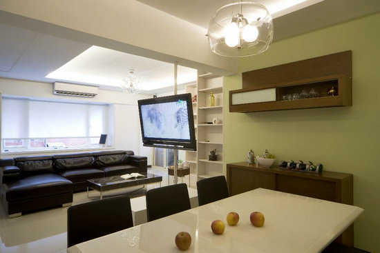 客厅电视部份做360度的调整设计,可以让身在餐厅的成员,享受影音的效果,与厨房之间以清玻璃搭配实木为主的框架线条,展现二者之间通透延续的视觉表现。