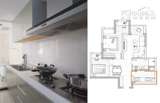 把生活阳台利用起来,纳入卫生间的区域,厨房由原先的L型改为一字型,增加通道的面积,同时冰箱放置在厨房内。