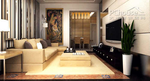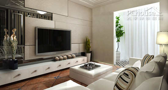 电视墙面采用灰镜加上局部的皮革硬包,使电视墙面,由于材质的运用,让电视墙充满时代的气息。
