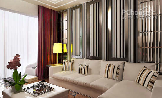 沙发背景大胆运用条纹墙纸,体现出干练的主人特质,工艺造型的镜面,更加体现出时尚的节奏,拐角式沙发干净简洁,明快洒脱,再一次表达了现代的推崇。