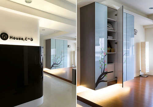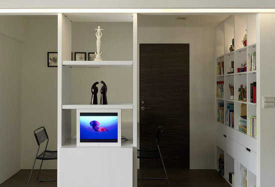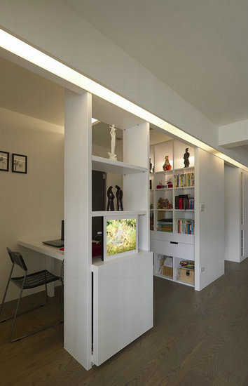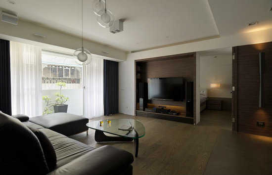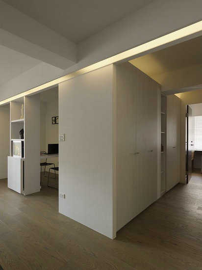 同样的对称手法亦使用在客厅的电视墙面,设计师于墙面左方以柜体线条包覆结构柱体,推开右方的柜体线条,则能通往长辈房的空间。
