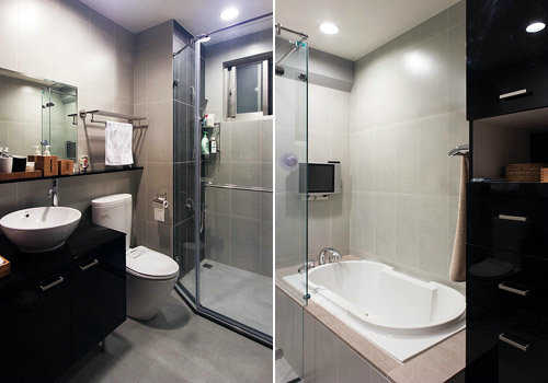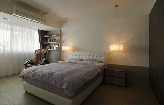 设计师还另在客卫浴的墙面改以可透光的玻璃砖活泼墙面的丰富性,夜晚时分流泄出的光晕营造出温暖的情境氛围。