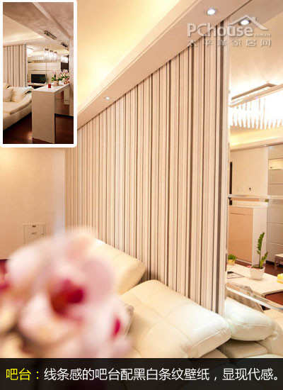 线条感的吧台配合墙面的黑白条纹壁纸,尽现现代感。