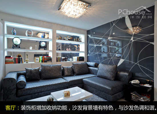 客厅沙发背后一面是装饰柜,这个柜子既可以当书柜,也可以当装饰柜,收纳能力强大,镜面元素的采用,使整个空间更通透,而沙发背景墙非常有特色,色调与沙发一致,非常的协调。