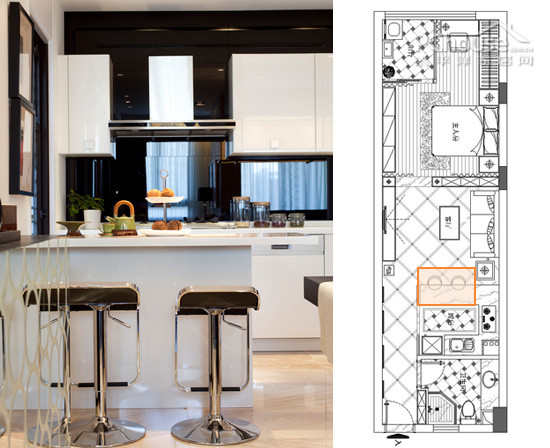 二,在空间规划上将卫生间和厨房互换位置,厨房作为开放式,一方面延伸了客厅的视野,空间操作更加方便实用,在橱柜左侧做为吧台,方便主人在此就餐,品茶,聊天,品酒等功能。