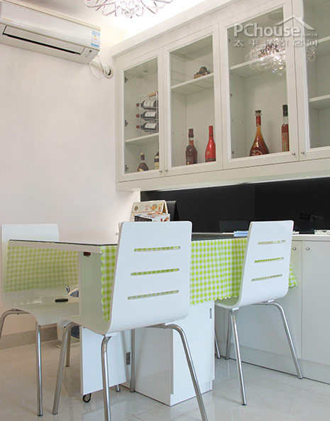 桌子为可伸缩餐椅,灵活这个小空间。餐桌搭配了一浅绿色的格子餐布,带来春天的清新感。