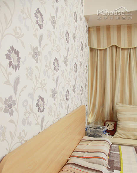 床头背景墙采用小碎花的墙纸,再加上以绒布黄色为主的遮光窗帘,让整个空间变得舒适浪漫。