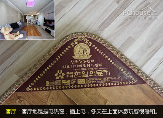细节2:开放式的客厅、餐厅、厨房设计,使整个空间大气通透,摆脱小户型的局促感。客厅上铺的是电热毯,而不是普通的地毯,这个是业主从韩国买回来的,价钱便宜,功能强大,冬天的时候插上电,在上面休息玩耍都是非常暖和的。