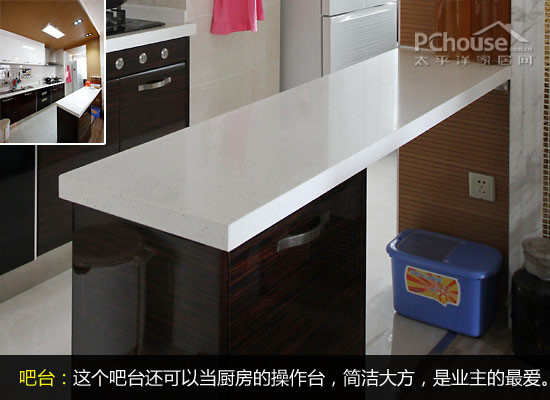 理由4:吧台功能强大,既可以作为厨房的操作台,又可以在这里和朋友悠闲的喝点小酒。业主是一个韩迷,吧台上摆放的泡菜可是业主家必不可少的东西。