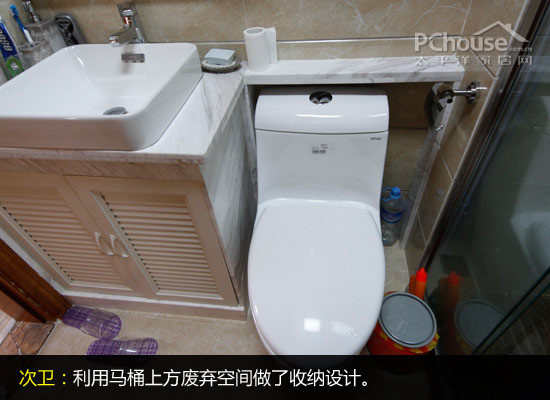 收纳3:设计师巧妙利用马桶上方的空间,用大理石做了一个横出台面,可以放纸巾和一些杂物,并且与浴室柜的大理石台面很好的融为一体,美观实用。