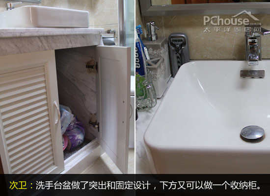 收纳4:洗手台盆是做了一个突出和固定设计,防止洗手台盘的滑动和水流溅出,下方腾出来的空间可以做一个收纳柜,放一些浴室的杂物。