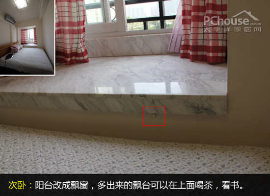 收纳2:这个卧室是把阳台空间改造了飘窗,飘台的下面也是暗藏玄机,里面做了一个隐形的收纳设计,打开图上标注的开关,这个小小的空间可是可以收纳很多小东西。