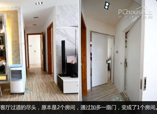 玄机1:从客厅的过道过去,正中间有一扇门,设计师通过多加这一扇门,把之前的2房改造成了1房,也就是一个整体的主卧空间,打开这扇门,卧室、卫生间、书房又各自有门,是单独的空间,非常方便。