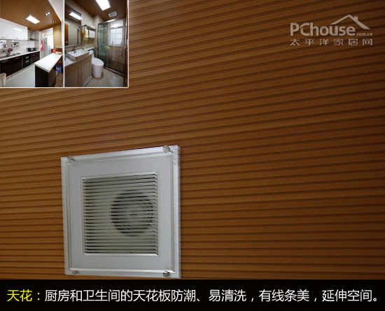 细节1:厨房和卫生间的吊顶都是根据空间来定制的,材料是塞托玛,这种材质耐脏、防潮、防水、易清洁,而且体现了线条美,有延伸空间的作用,坐在厨房和卫浴间非常的合适。