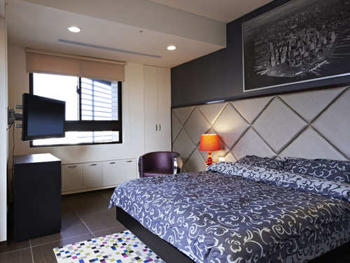 为不造成建筑体带来的畸零浪费,独享设计将此作成收纳量体,搭配上旋转电视将空间回归于睡眠本质。