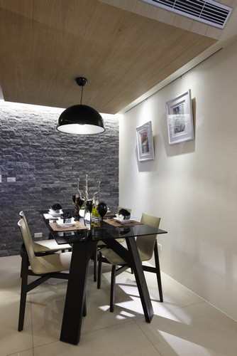 微倾地木作天花隐藏冷气管线,在一旁文化石墙与灯光照明中,只见自然温馨。