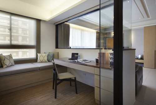 考虑未来小朋友学步前的爬行安全,家中没有设置锐角家具,而无茶几的设计,让小朋友有更大更安全的活动空间。客厅与后方书房间以清玻隔间形塑通透视野,并加深窗边的卧榻宽度,未来也可当做客房使用。