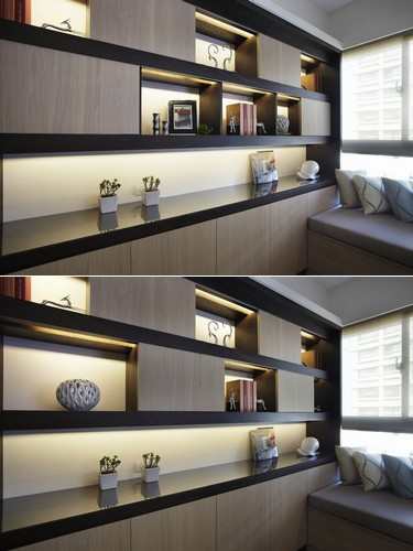 电视主墙与两侧开门三段落的ㄇ字型起伏,一致性色彩以高度变化出视觉层次。