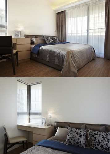 设计师保留基本的卧眠与梳妆机能,让双面采光窗外的自然光影变化缀点卧眠情境。