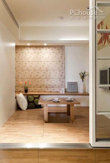 房间以地台的方式设计,规划出了收纳区域,以深浅不同的实木搭配出层次感。壁柜的设计藉由玻璃及格状式的木作规划为门片,通透而具悠闲质感。