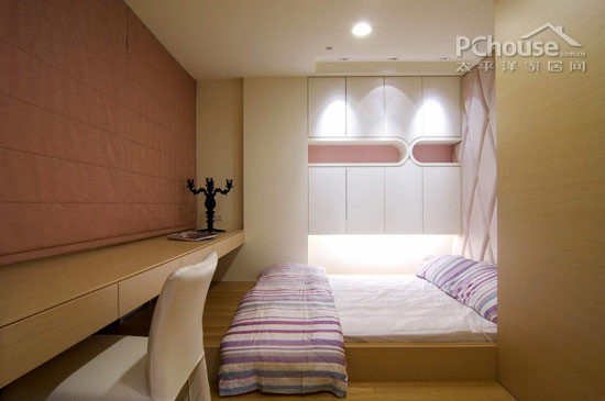 地台设计的卧室家具简单,装饰性不强。可以在装饰性上增加美观度,透过菱格状的绒布作为主墙背景,卧眠区以架高木作设计,柜体以白、粉红及弧线造型规划,铺述出女孩浪漫优雅的生活态度。