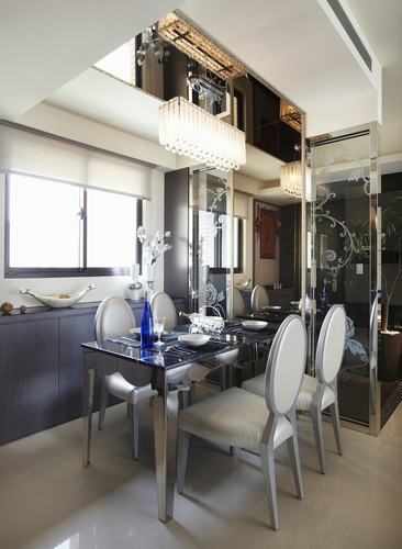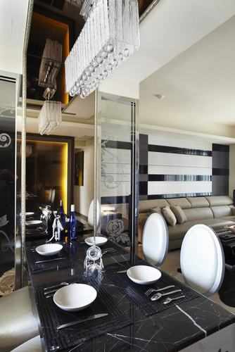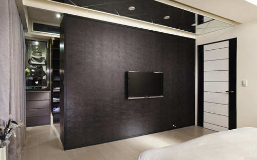 两房合一的主卧空间,设计师于床尾处做出镜面悬板天花,菱格造型呼应床头绷布演绎精品语汇。