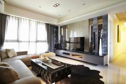 梁多且大的本体限制,设计师在客厅天花施以流线弧形,精算过的曲线收住7.1声道音响及投影机,完美挑高视野尺度。